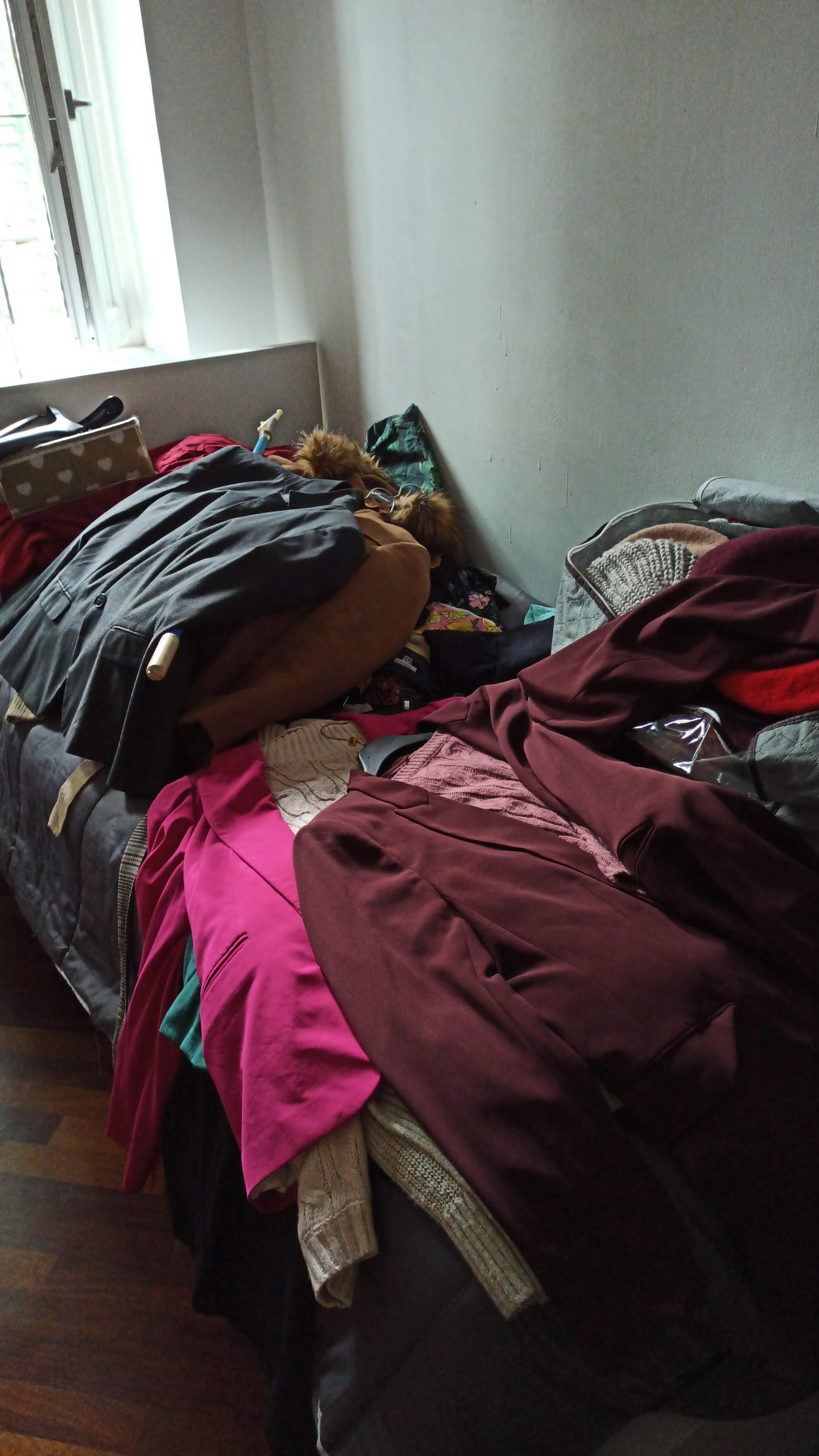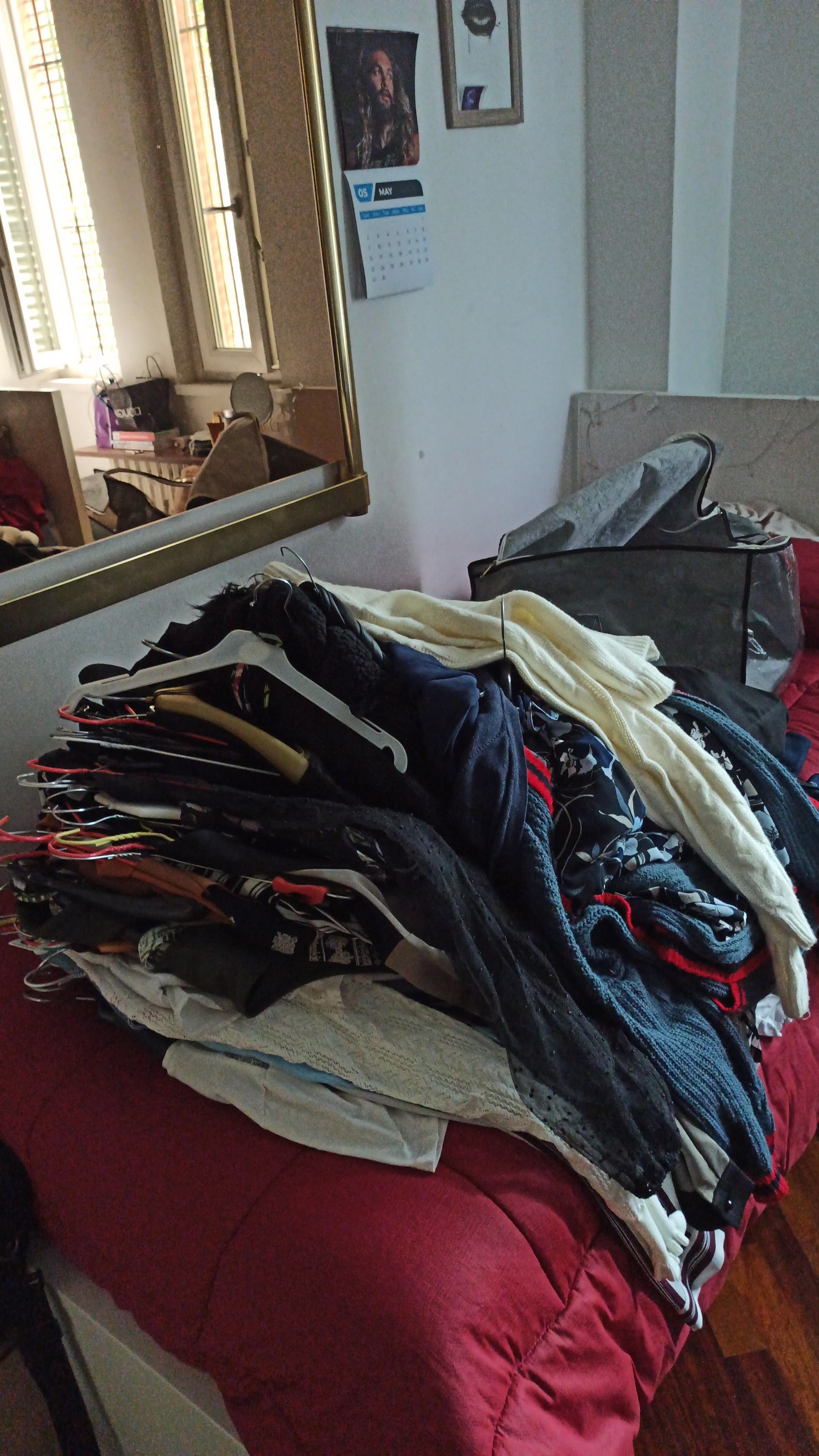 Dopo il primo momento di pazzia in cui ho lanciato tutto sul letto, svuotato l’armadio, i cassetti e i vari scatoloni, ho avuto un attimo di panico a vedere tutto così accatastato e ho pensato : ” Cavolo, ragazza! Hai davvero un botto di cose! Datti una calmata! Tanti auguri!”